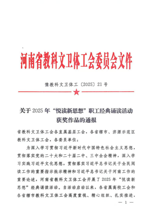近日获悉,河南省教科文卫体大象tv在线发布《关于2025年“悦读新思想”职工经典诵读活动获奖作品的通报》,我校洹滨校区教师刘亚铭老师作品《祖国啊,我亲爱的祖国》获得长视频三等奖。